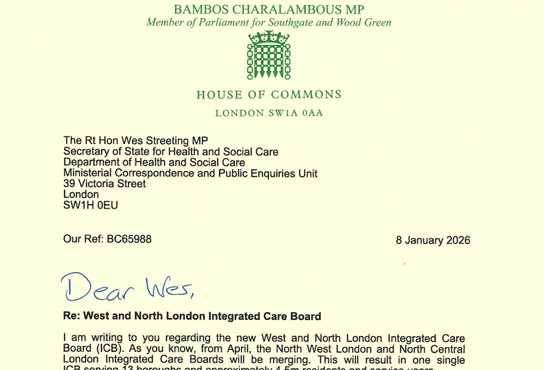 Concern about ICB Merger January 8, 2026/in Enfield Southgate, Health, News, Southgate and Wood Green /by Bambos Please see below the letter I have sent to the Secretary of State for Health and Social Care relaying my concerns about the upcoming Integrated Care Board merger. BC65988Download https://www.bambos.org.uk/wp-content/uploads/2026/03/Screenshot-2026-03-11-130209.png 532 783 Bambos https://www.bambos.org.uk/wp-content/uploads/2020/12/BC-Logo.svg Bambos2026-01-08 13:03:002026-03-11 13:08:33Concern about ICB Merger