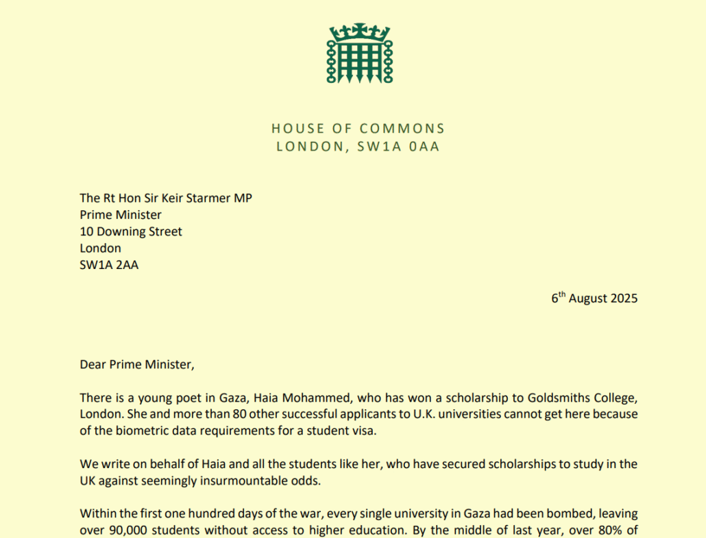 Please see below the letter to the Prime Minister that I have signed to call for safe evacuation routes for Gazan students with scholarships in the UK.